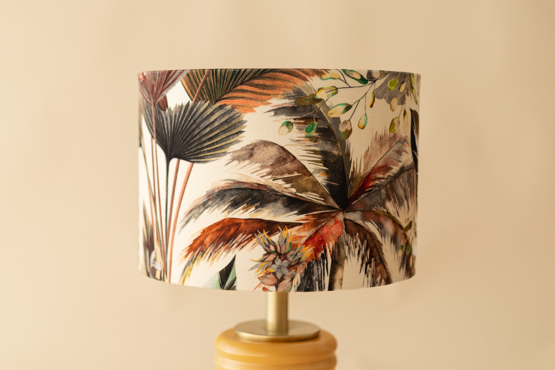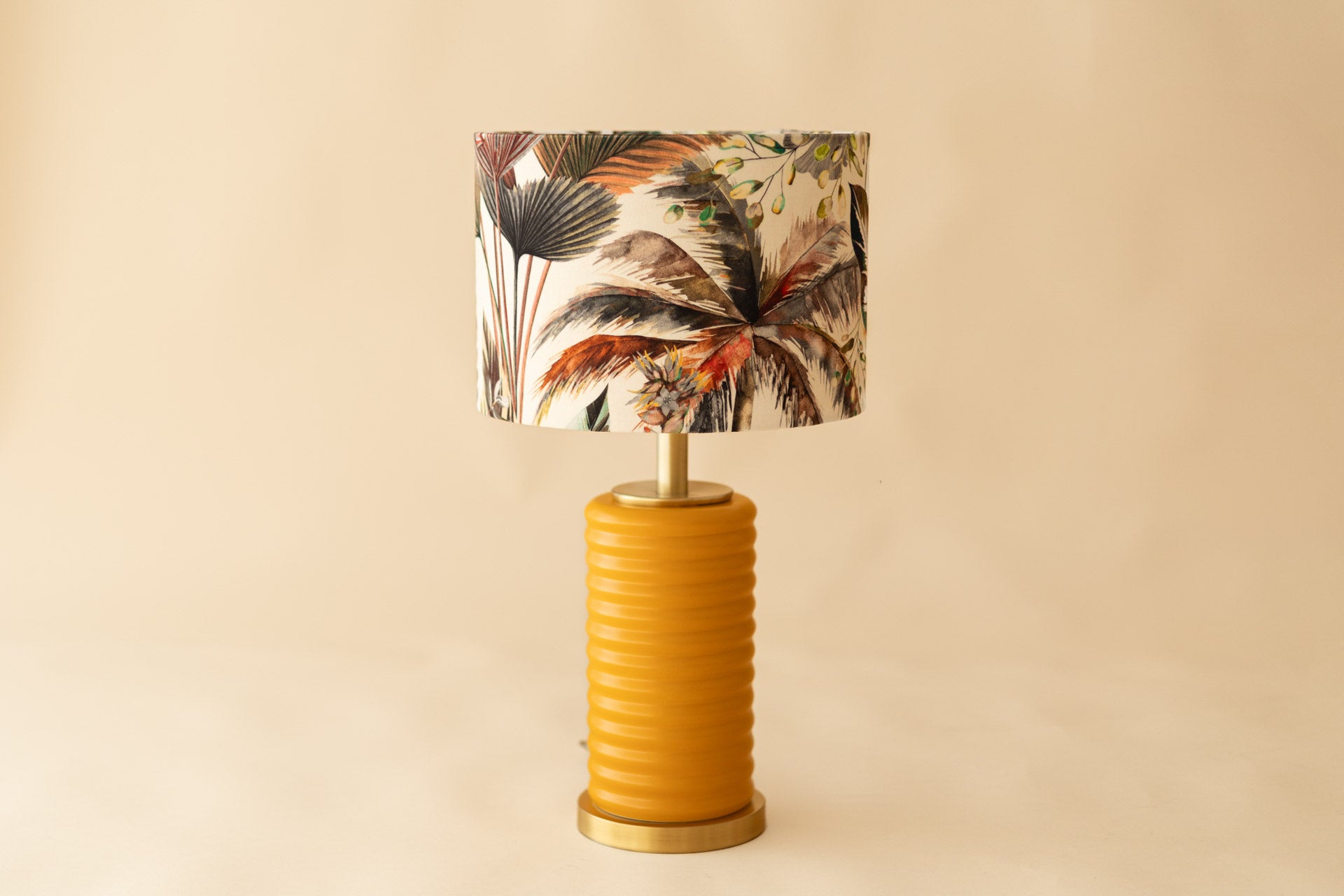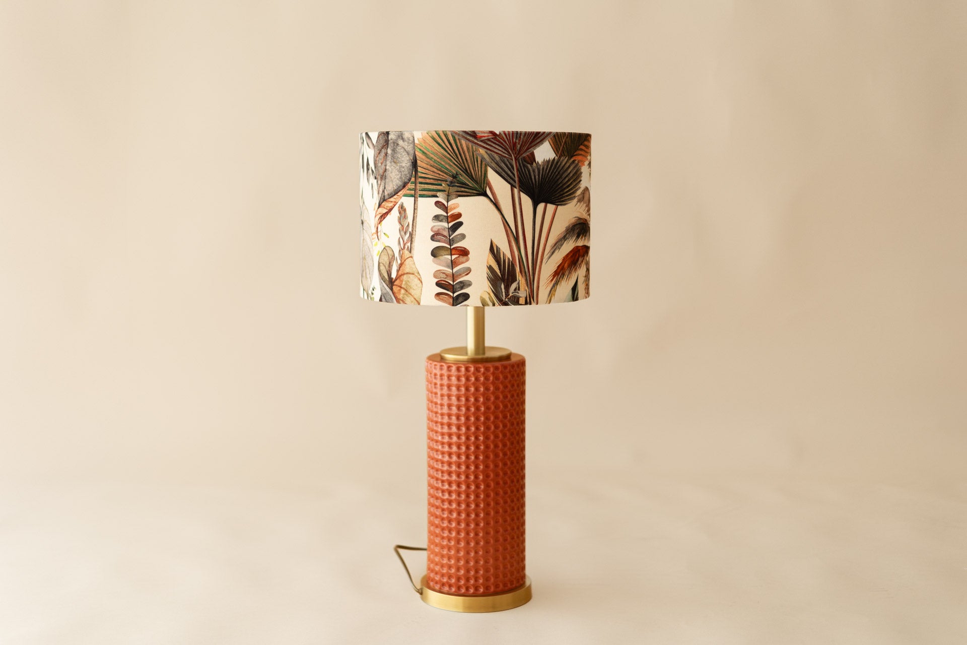 A base em cerâmica terracota evoca a terra molhada, enquanto o abajur exibe uma dança de folhas tropicais num fim de tarde dourado, como se o verão deixasse ali as suas últimas memórias. O Jardim de Outono é um convite ao conforto, à natureza e ao design artesanal com alma portuguesa.