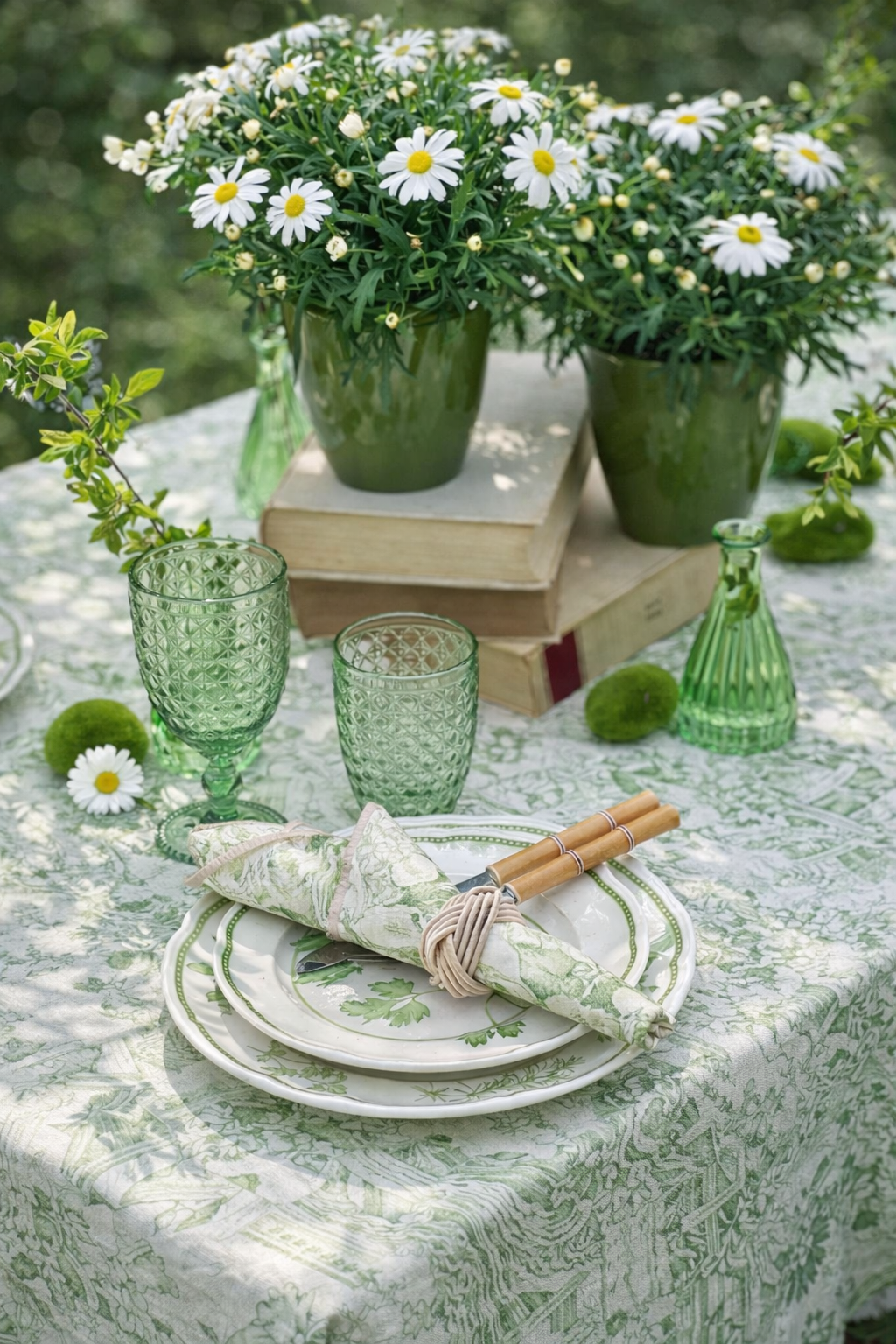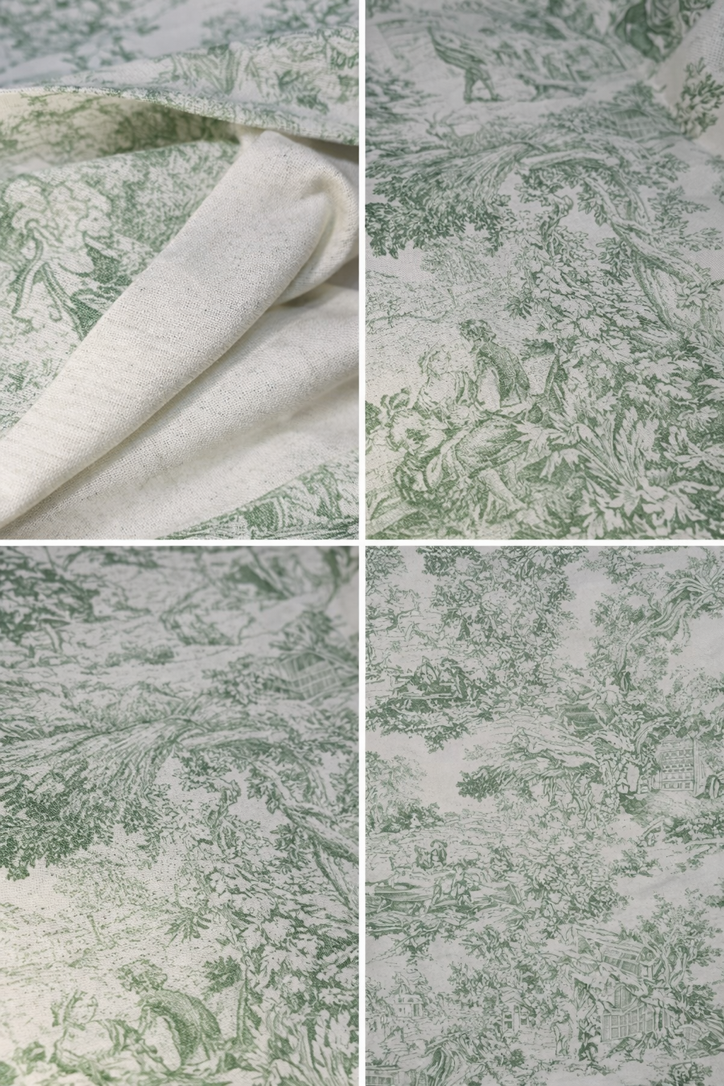 A toalha Memórias Rurais evoca cenas de uma vida simples e serena, onde o tempo corria ao ritmo da natureza e das refeições partilhadas. O desenho clássico, inspirado nos antigos padrões campestres, revela pequenas histórias do quotidiano rural, impressas em verde suave sobre uma base clara de aspeto natural.